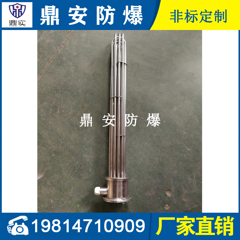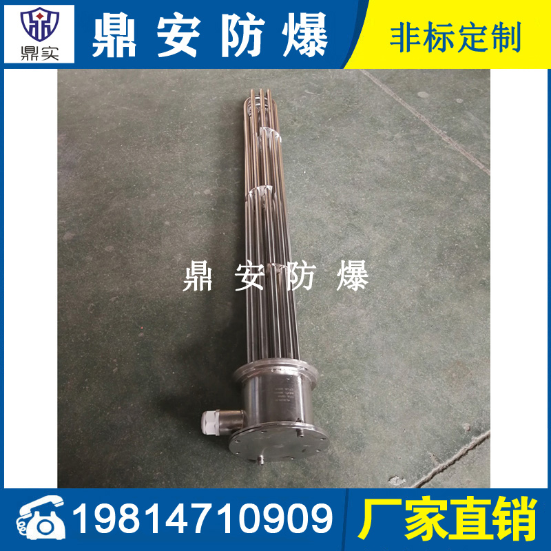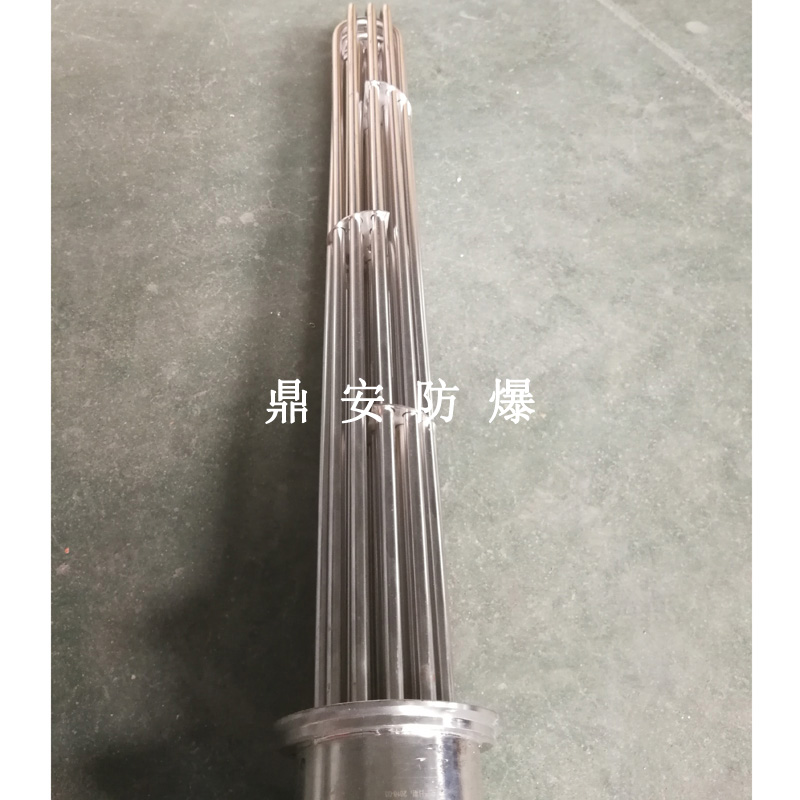 法蘭電熱管(也稱插入式電加熱器):是采用U型管狀電熱元件,多支U型電熱管焊接在法蘭上集中加熱,依據加熱不同介質設計規范,按照功率配置要求裝配在法蘭蓋上,插入需加熱物料中,發熱元件工作時所發出的大量熱量傳導給被加熱介質使介質溫度升高,達到所需的工藝要求,主要用于敞開式、封閉式的溶液箱和循環系統中加熱用。