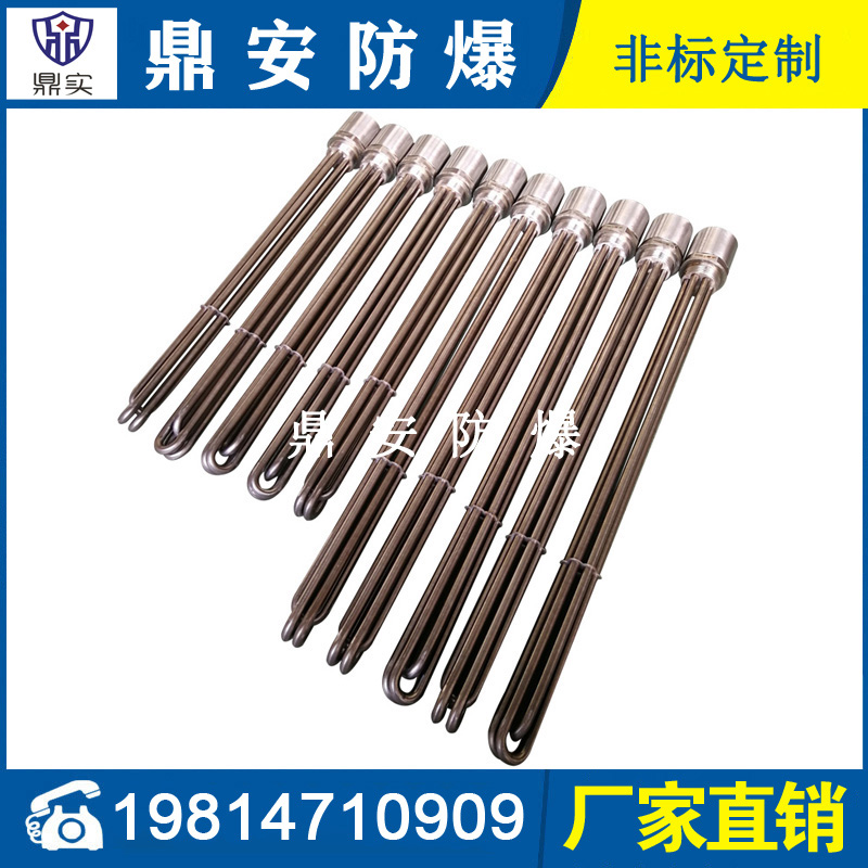 法蘭電熱管(也稱插入式電加熱器):是采用U型管狀電熱元件,多支U型電熱管焊接在法蘭上集中加熱,依據(jù)加熱不同介質(zhì)設(shè)計(jì)規(guī)范,按照功率配置要求裝配在法蘭蓋上,插入需加熱物料中,發(fā)熱元件工作時所發(fā)出的大量熱量傳導(dǎo)給被加熱介質(zhì)使介質(zhì)溫度升高,達(dá)到所需的工藝要求,主要用于敞開式、封閉式的溶液箱和循環(huán)系統(tǒng)中加熱用。