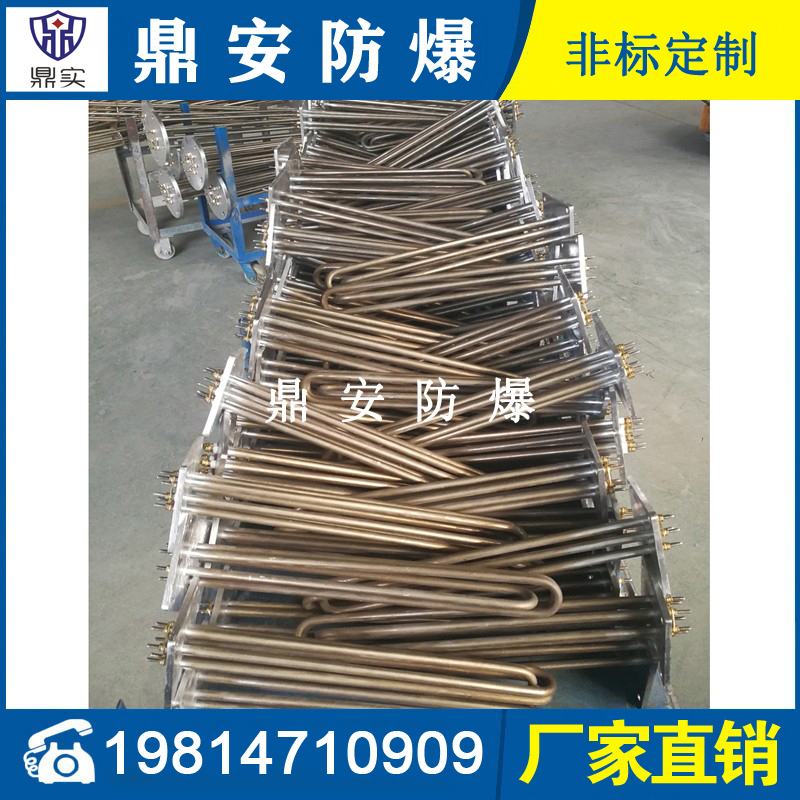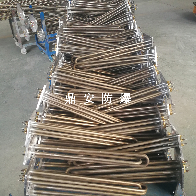 法蘭電熱管(也稱插入式電加熱器):是采用U型管狀電熱元件,多支U型電熱管焊接在法蘭上集中加熱,依據加熱不同介質設計規范,按照功率配置要求裝配在法蘭蓋上,插入需加熱物料中,發熱元件工作時所發出的大量熱量傳導給被加熱介質使介質溫度升高,達到所需的工藝要求,主要用于敞開式、封閉式的溶液箱和循環系統中加熱用。