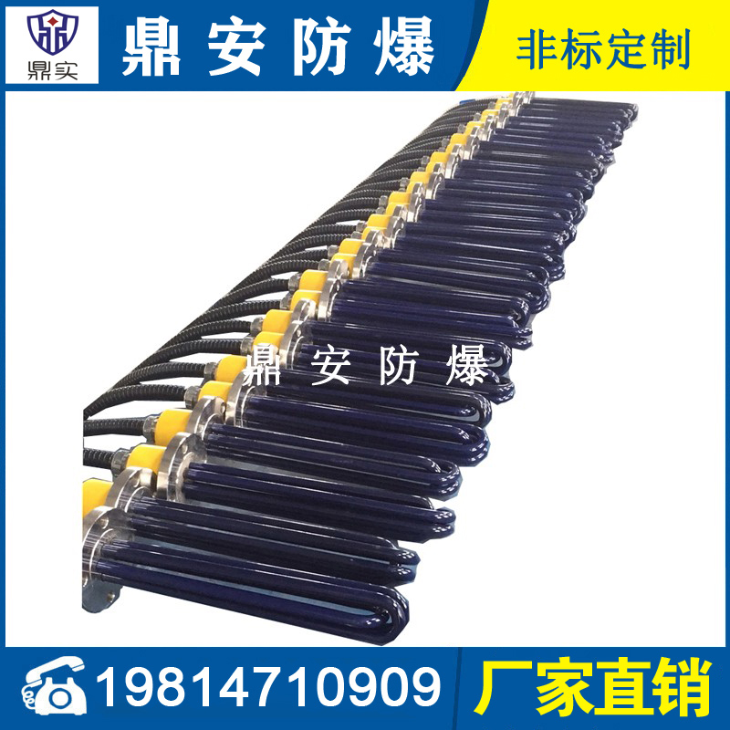 法蘭電熱管(也稱插入式電加熱器):是采用U型管狀電熱元件,多支U型電熱管焊接在法蘭上集中加熱,依據加熱不同介質設計規范,按照功率配置要求裝配在法蘭蓋上,插入需加熱物料中,發熱元件工作時所發出的大量熱量傳導給被加熱介質使介質溫度升高,達到所需的工藝要求,主要用于敞開式、封閉式的溶液箱和循環系統中加熱用。