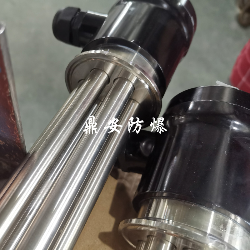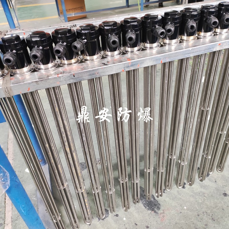 法蘭電熱管(也稱插入式電加熱器):是采用U型管狀電熱元件,多支U型電熱管焊接在法蘭上集中加熱,依據加熱不同介質設計規范,按照功率配置要求裝配在法蘭蓋上,插入需加熱物料中,發熱元件工作時所發出的大量熱量傳導給被加熱介質使介質溫度升高,達到所需的工藝要求,主要用于敞開式、封閉式的溶液箱和循環系統中加熱用。