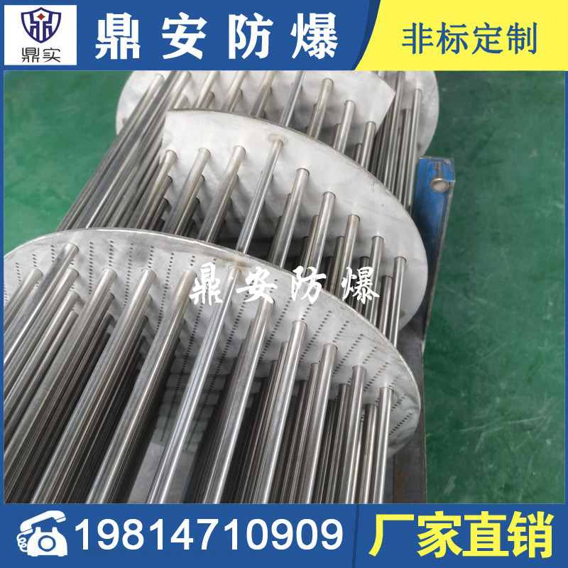 防爆法蘭加熱管是由多支加熱管焊接在法蘭上集中加熱。主要用于敞開式、封閉式的溶液箱和循環系統中加熱用。優點: 表面功率大,使一般電加熱表面負荷的2~4倍,高度密集式、結構緊湊。由于整體短而密集,故穩定性好,安裝無需支架。組合式法蘭加熱管大多采用氬弧焊接方式使電熱管于法蘭連接,也可利用緊固裝置的形式,即每支電熱管上焊由緊固件。然后與法蘭蓋采用螺母鎖緊。管子于緊固件采用氬弧焊接。緊固件密封處采用科學的工藝。單支更換方便,大大節約以后的維修成本選擇進口及國內優質材料。科學的生產工藝,嚴格的質量管理,保證電熱管優越的電氣性能。